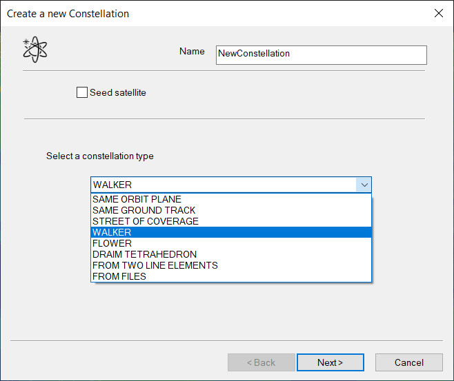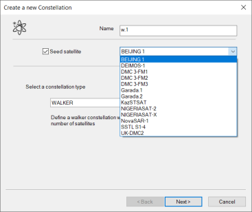 The Constellation wizard allows you to optionally define a seed satellite that will be used to fill default orbit parameters and as a pattern for the sensors and other configurations of the constellation satellites.