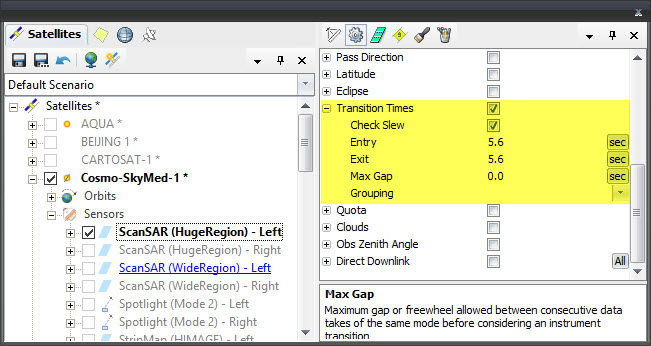 - If the satellites performs left / right slewing (e.g. Cosmo Skymed) the slewing time lag will be calculated for the angle distance between left and right slewing. Note that for this feature to work you need to link Left and Right modes with the same non-empty Grouping tag.