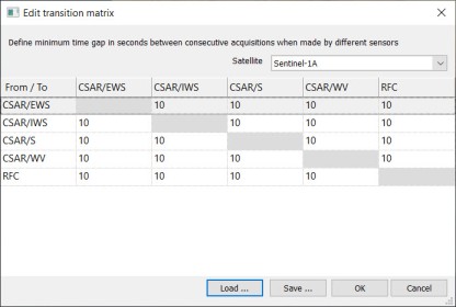 REMARK: Transition Times are better managed with a Transition Times matrix because transitions are often dependent of the mode source and mode destination (see e.g. agile satellites). The transition matrix allows to define minimum transition times to be respected between acquisitions of different sensors within the same satellite. The acquisitions will be shortened as needed to comply with the transition time.