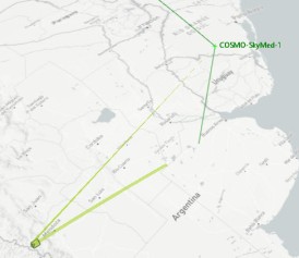 In the example below, a small area of interest over the Andes, close to Santiago de Chile, is covered with Cosmo-Skymed 1, HIMAGE mode. The area is located at circa 5000 meter altitude. The images below show the swath footprint obtained by SaVoir with both Ellipsoid and DEM, showing the expected side-shift due to altitude.