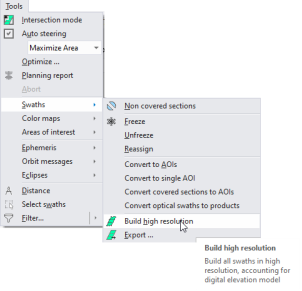 The footprint with DEM can be also rendered at high resolution. A new feature allows to build the swath in high or low resolution, by right click menu on the swath footprint. It is also possible to build all visible swaths in high resolution with the Tools / Build high resolution menu.