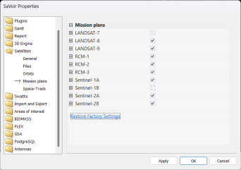 - Select the desired satellites and sensors with a Mission Plan configuration
