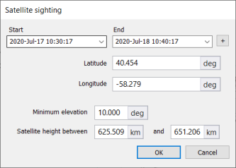 - Satellite orbit height range for valid observations. Initially configured with the current selected satellites minimum and maximum heights.