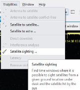 The function is called from menu Visibilities / Satellite sighting .... The menu is active only if there are satellites selected in the satellites scenario tree.
