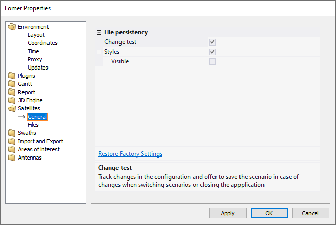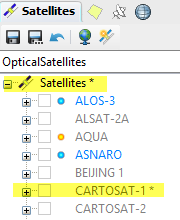 They can be managed via the Edit / Properties /<scenario>/ General pages, applicable to each scenario file: satellites, areas of interest or antennas.