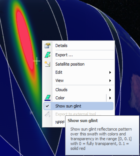 Sun glint can be visualized over any swath by pop-up menu "Show sun glint". The swath will be drawn by displaying the sun glint area in colours, ranging from blue to red, and increasing transparency. Sun glint normalized reflectance will be displayed only in the range[0, 0.1], with 0 = fully transparent , and 0.1 = solid red.