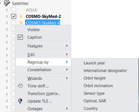 the Satellites scenario tree can be reorganised by defining a regrouping criteria, according to Launch year, Orbit height, International designator (Launch ID), etc. |