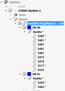 The Satellite scenario tree has been upgraded to show the swaths associated with a given sensor mode also on the tree. |