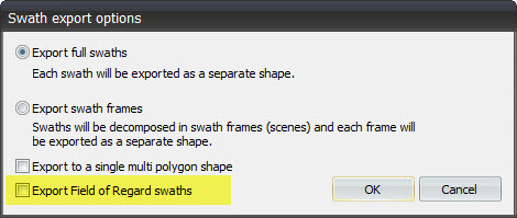 New feature to export Field of Regard swaths to shape file. Before it was not possible to export FOR swaths. This is now selectable in the pop-up dialog before exporting swaths.