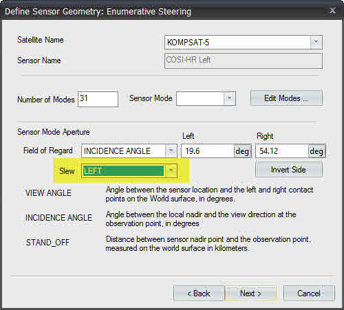 Left looking modes (see COSMO, TerraSAR-X, etc) are now configured with positive look angles, same as Right looking modes. The Left look side is identified by the Slew parameter.