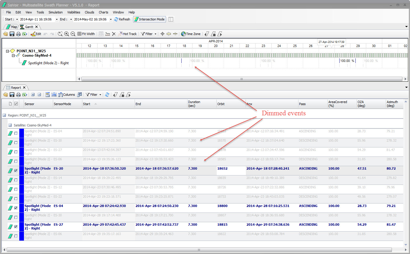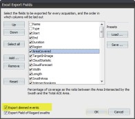 New feature allows to decide whether exporting or not dimmed events on Excel. Dimmed events are events partially visible on Gantt, Reports or Maps, as a result of "Highlight this only", "Highlight overlapping swaths", or simply event selection on the Report view. |