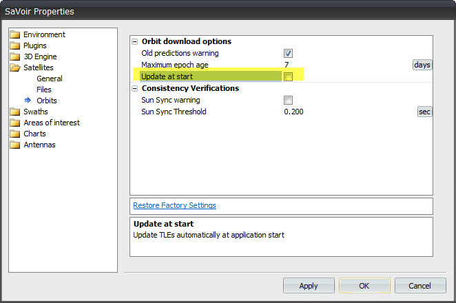 Option to update always TLEs at program start. See Edit / Properties / Satellites / Orbits |