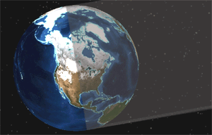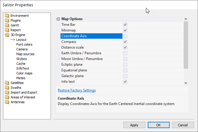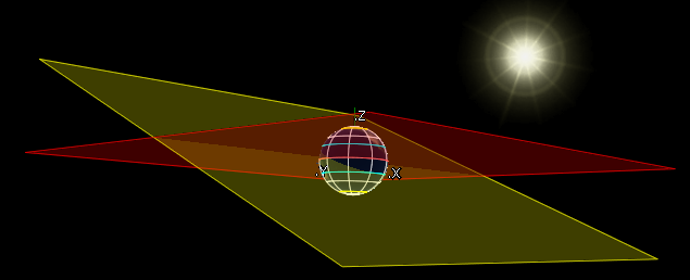In order to help the user with the orientation of the Earth relative to the Sun, it is possible to show the ecliptic plane (yellow), the equatorial plane (red) and the coordinate axis of the Earth. Toggle on and off viewing of the specific option by selecting and de-selecting it in the Properties> 3D Engine > Layout submenu under the Edit menu.