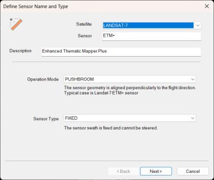 A new sensor can be created for SaVoir by using the sensor wizard. The wizard creates new satellite sensors based on parameters such as steering type and sensing angles.