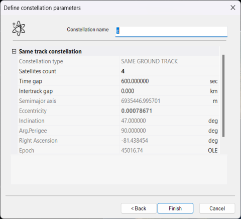 - Optionally define an inter-track gap distance. Normally leave this parameters to zero, to enforce that all satellites pass over the same sub-satellite track. The inter-track gap allows to separate tracks by a given distance, measured at the equator.