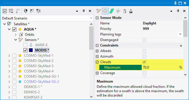 The Maximum threshold is applied to the Cloud Forecast parameter. If this is not available (e.g. lack of internet, swath time out of forecast time boundaries), the Cloud Statistic will be applied instead. If neither Forecast nor Statistic is available, the constraint will not be applied.