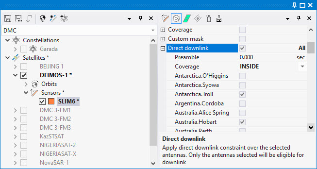 Direct Downlink constraint will trim all swaths generated with this sensor to be compatible with direct downlink on the selected antennas. In other words, the sensing start and stop times will be selected so that sensing occur simultaneously with antenna visibility.