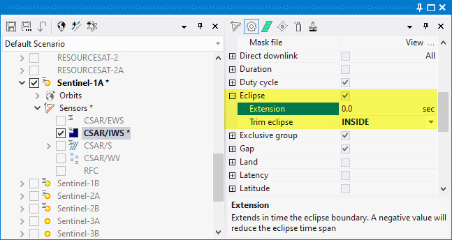 When enabled the Eclipse constraint will ensure that no sensing operation is performed when the satellite is in Eclipse. This occurs when the line of sight between satellite and the Sun is obstacled by the Earth.