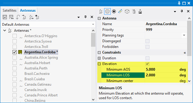 The Elevation Constraint allows to define minimum elevation angles for a given antenna for the purpose of pass scheduling