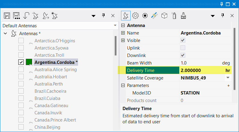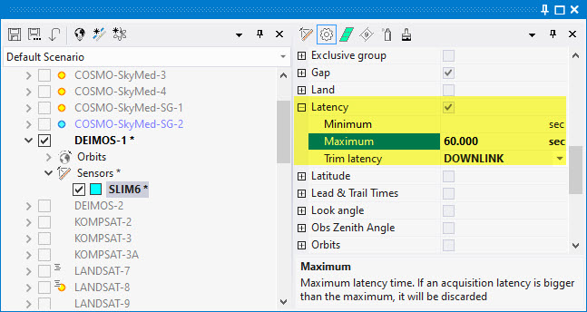 - DELIVERY: Latency is measured from Sensing to Delivery to user. The Delivery is an additional delay on top of the Downlink delay. It is the result of adding the constant Delivery Times configured in the satellite, the sensor and the antenna that participate in the generation and downlink of the data take. By default all delivery times are configured as 0 seconds, in which case the DELIVERY option will yield the same result of the DOWNLINK option
