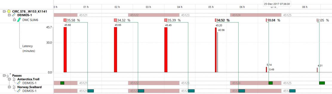 You may plot the latency values for an acquisition plan on the Gantt by right click on the types bar and select "Latency". You may need to generate a visibilities time line (menu Visibilities / Antenna to satellite) prior to plotting the latency values.