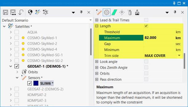 - Gap: Optional minimum interruption interval in the acquisition sequence. For example, some satellites can acquire a maximum strip length, and then interrupt acquisition for a given Gap time, needed for emptying their on-board flash memory into the recorder, prior to restart acquiring.