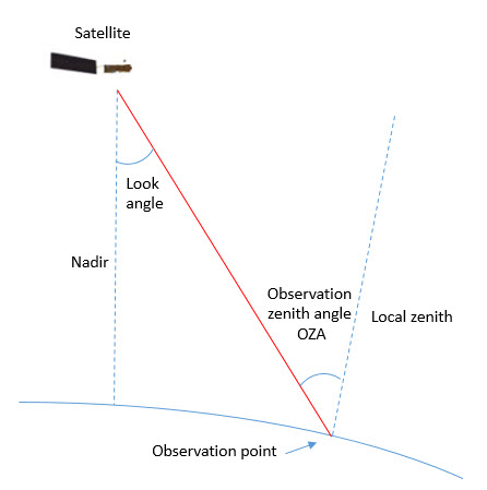 The Observation Zenith Angle (OZA), also called Incidence Angle, is the angle between the satellite vector and the local zenith measured at the observation point.