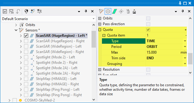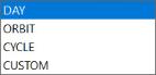 (2) Period:Time period on which the quota will be evaluated, whether DAY, ORBIT, CYCLE or CUSTOM period. The CYCLE option is available only for satellites with Sun Synchronous orbit. The CUSTOM option requires you to define the time period span explicitly.