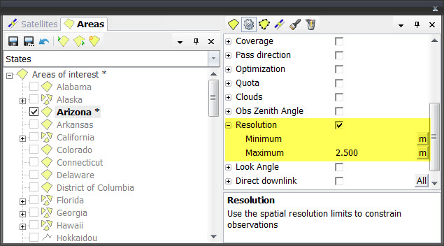 When the Resolution constraint is active any swath with resolution outside of the defined minimum and maximum values will be discarded.