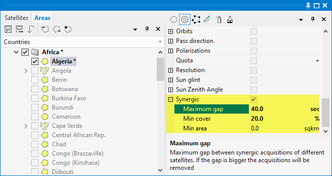 - Maximum gap: maximum allowed time distance between synergic acquisitions of different satellites