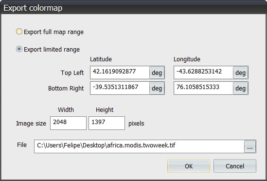 You will be requested to provide a file destination name, file format and map coordinates for a Plate Carree output. You may also modify the Image size in pixels.