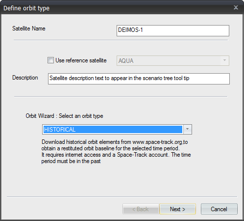 1. Open the Satellite Wizard and define a new orbit, selecting "HISTORICAL" type. Click Next