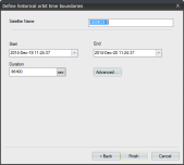 2. Select historical period time boundaries, being careful to select a period of time between launch and current time. Click finish. You may expect some delay, usually few seconds, for downloading the two line element series from Space-Track.