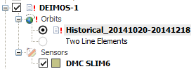 3. Make sure the satellite has been reconfigured with a new orbit within the defined period. The orbit name syntax is "Historical_<BEGIN_DAY>_<END_DAY>". Begin and End day correspond to the Epoch of the first and last TLE retrieved. The orbit will be shown in the satellites tree. A warning sign may appear if the current SaVoir simulation window is not fully inside the Historical orbit period of validity.
