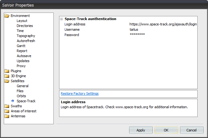 Two Line Elements will be downloaded automatically from Space-Track historical archive. You need to obtain a Space-Track free account and then insert you user name and password in Edit / Properties / Satellites / Space - Track, so that SaVoir will know how to log-in and interact with the Space-Track API. This needs to be done only once.