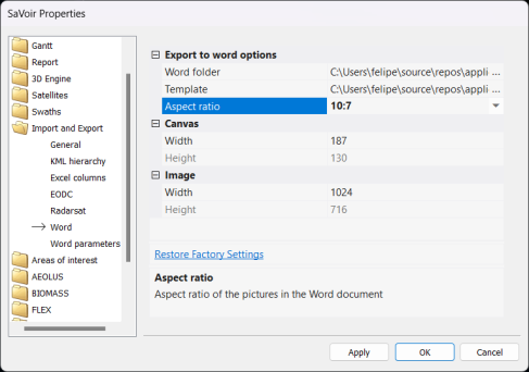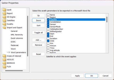 The set of parameters of each swath that are exported can be selected in the Word parameters section.