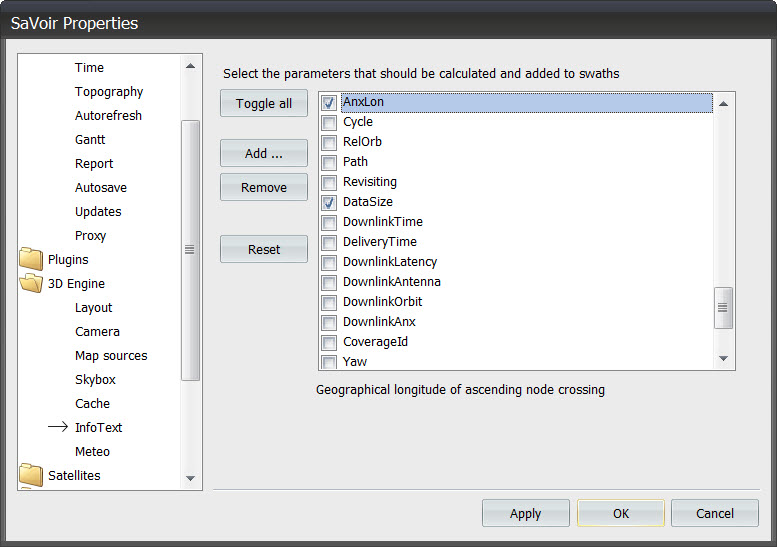 It is possible to customize the default behaviour, and add or define alternative swath parameters. This can be done via Edit / Properties / 3D Engine / Info Text