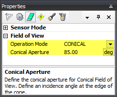 To define a conical sensor just create a copy of a regular sensor and convert it to Conical in the Swath properties grid by changing the Field of View Operation Mode.